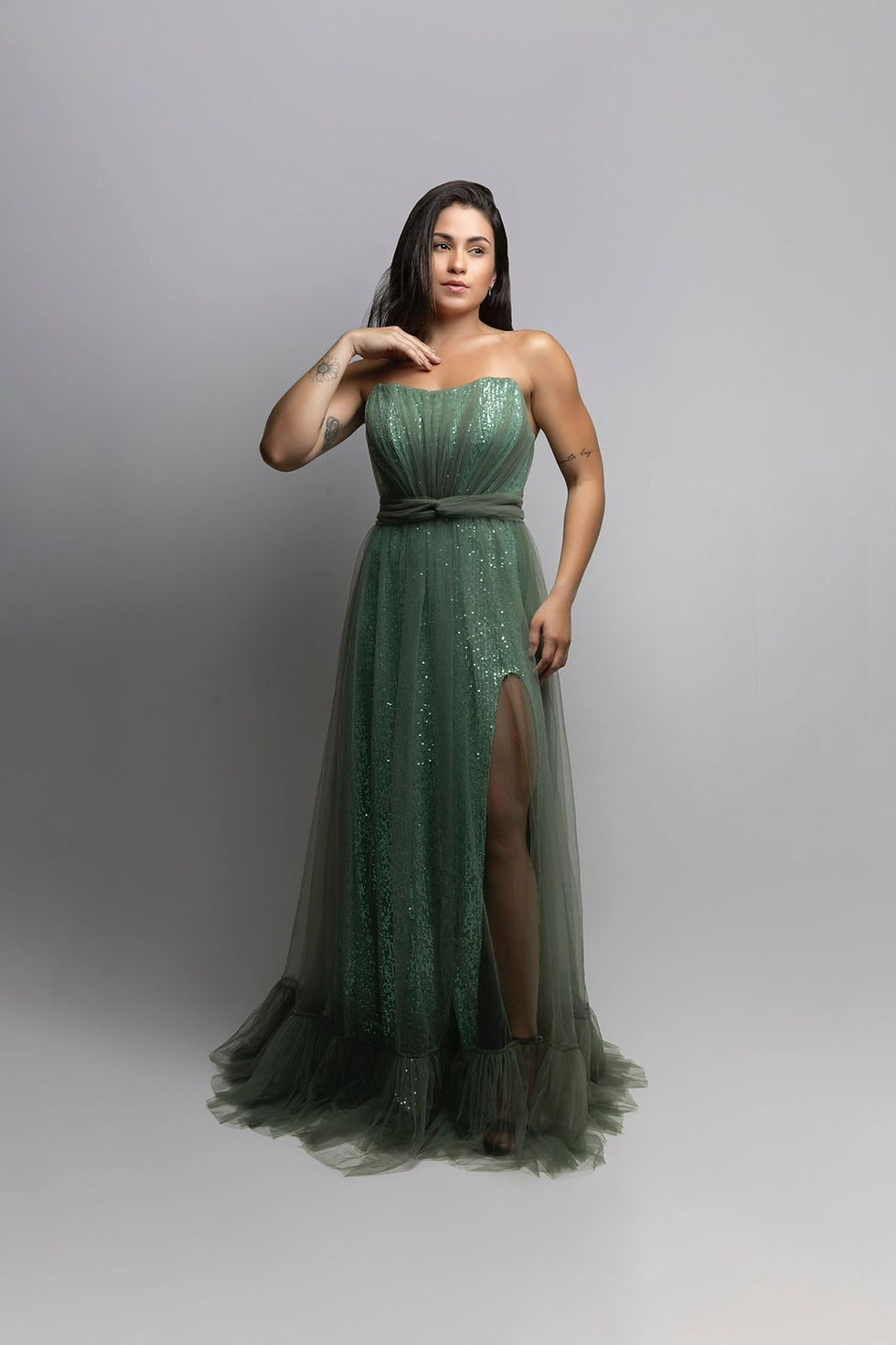 Aluguel - Vestido Longo verde oliva tule manga solta tres tiras de pedraria